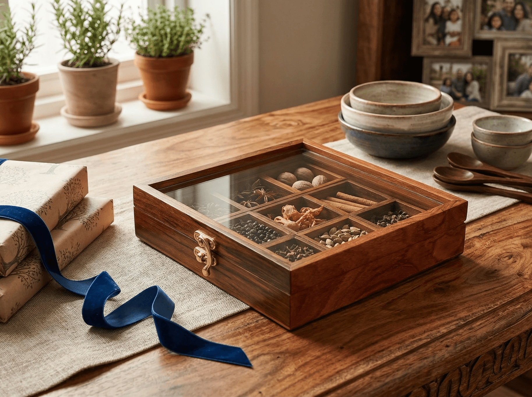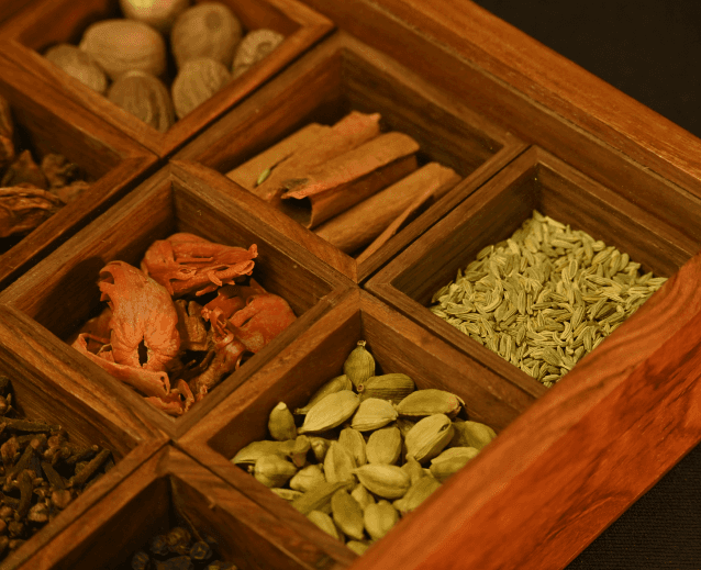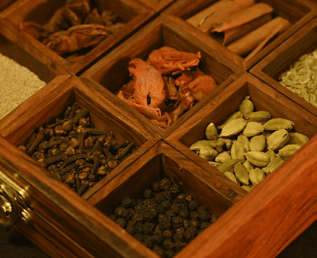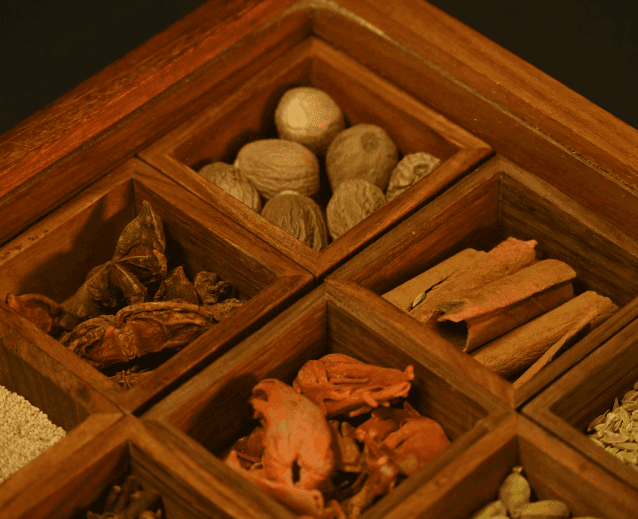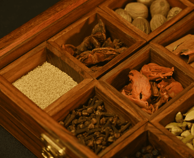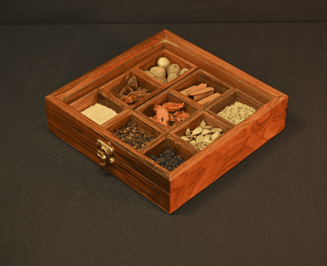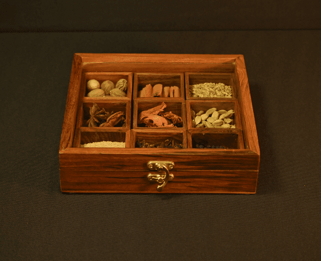 Presented in a wooden spice box with glass lid and nine compartments, SPICE ROUTE features premium spices from Shasha-House of Purity by Pansari Group.