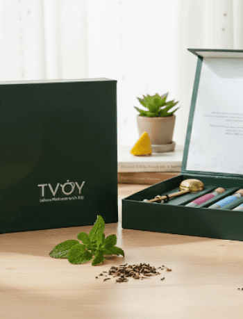 An uitra-modem pleather tea case with handle, designed like a compact suitcase for effortless carrying inside, six compartments hold 90 biodegradable pyramid tea bags of orthodox blend tees from TVOY
